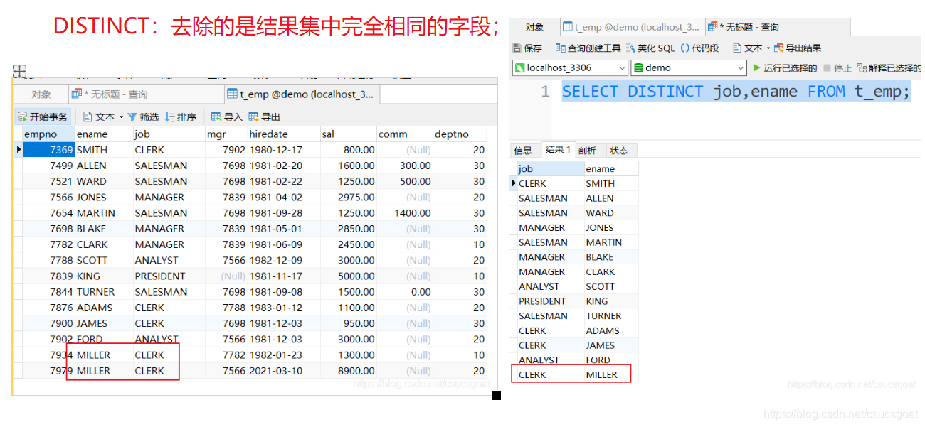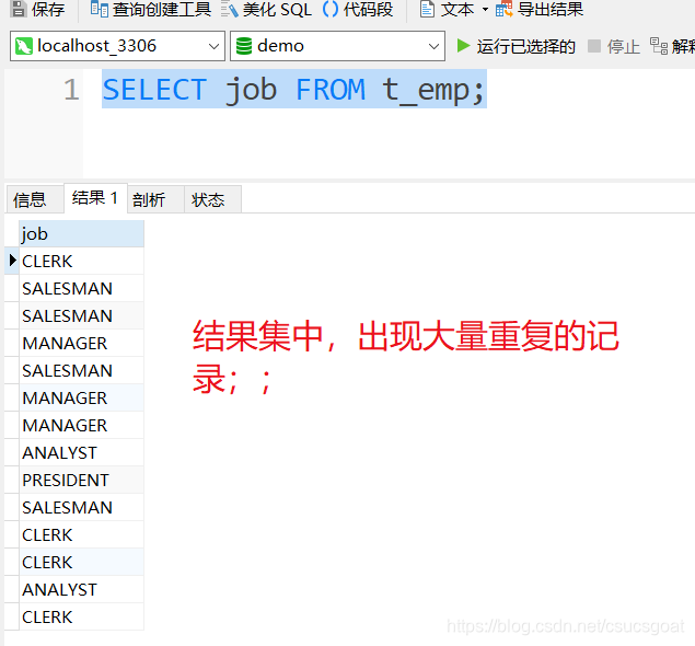 第二范式要求每张表都要有主键字段,主键是不能重复的,所以数据库中是不可能有完全相同的记录的;;;但是结果集就不一样了,如果SELETC中没有选择主键字段,那么结果集中就有可能出现完全一样的记录: