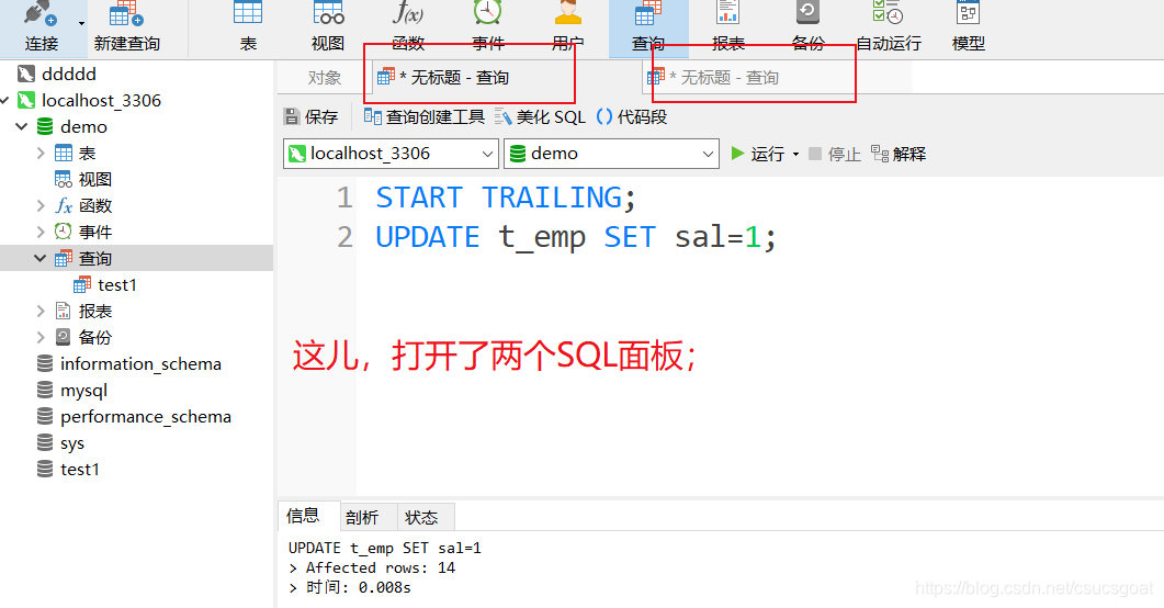 其中,“SET SESSION”意思是,设置当前会话的事务隔离级别;这种设置不是全局的,只在当前会话生效;会话的意思是:在Navicat中打开一个SQL面板,编写SQL语句,这个就是一个会话,当把这个面板关了,这个会话就结束了;