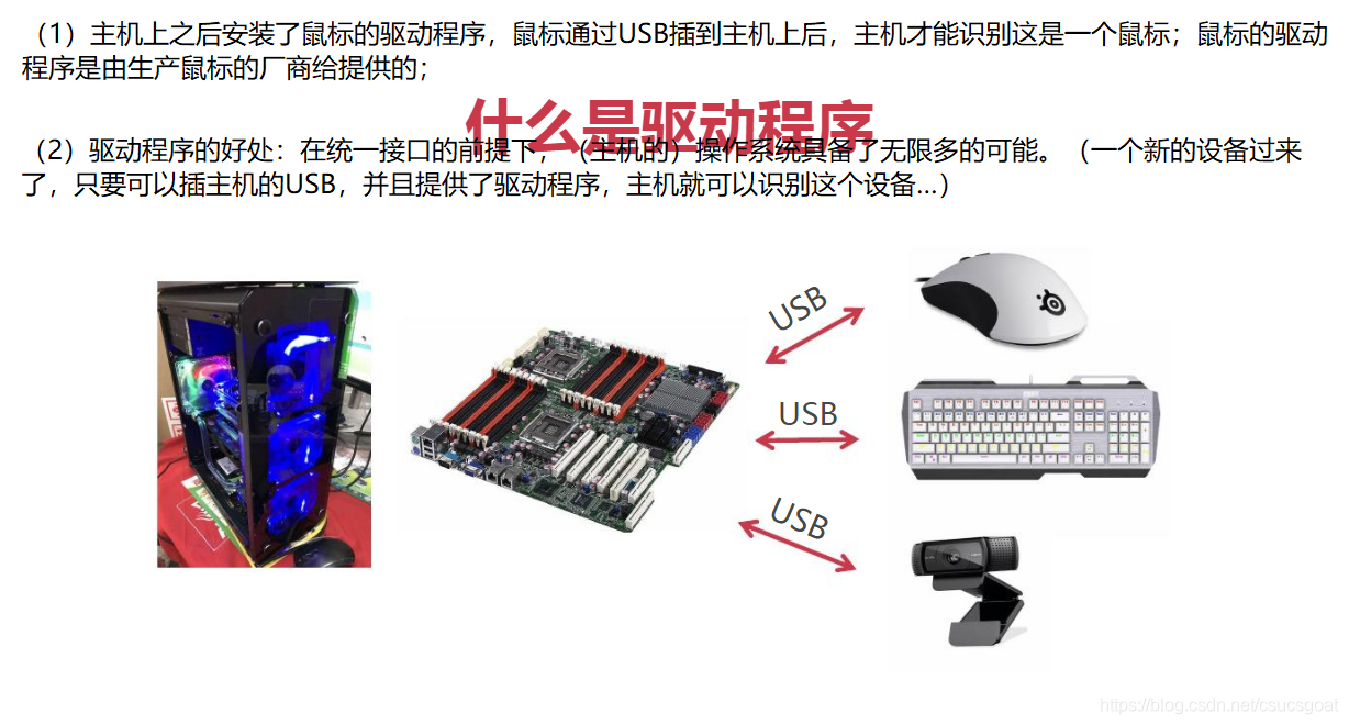 这个鼠标的例子只是为了说明:主机提供了统一的接入标准(USB),不同的设备要想插入到主机上,就必须开发一个符合主机标准的驱动程序。
