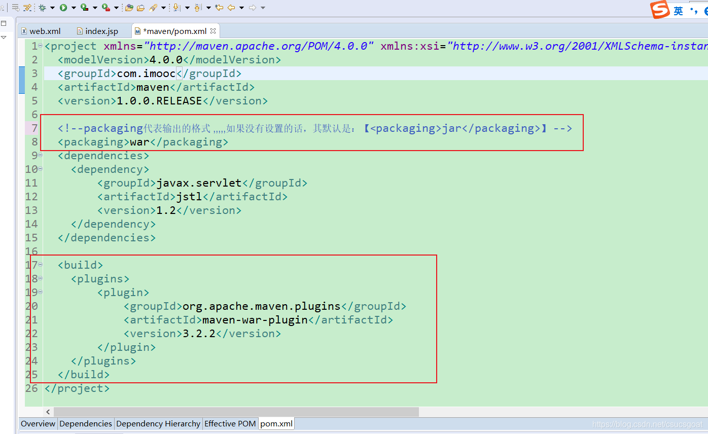 <!--packaging代表输出的格式 ,,,,,如果没有设置的话,其默认是:【<packaging>jar</packaging>】 -->