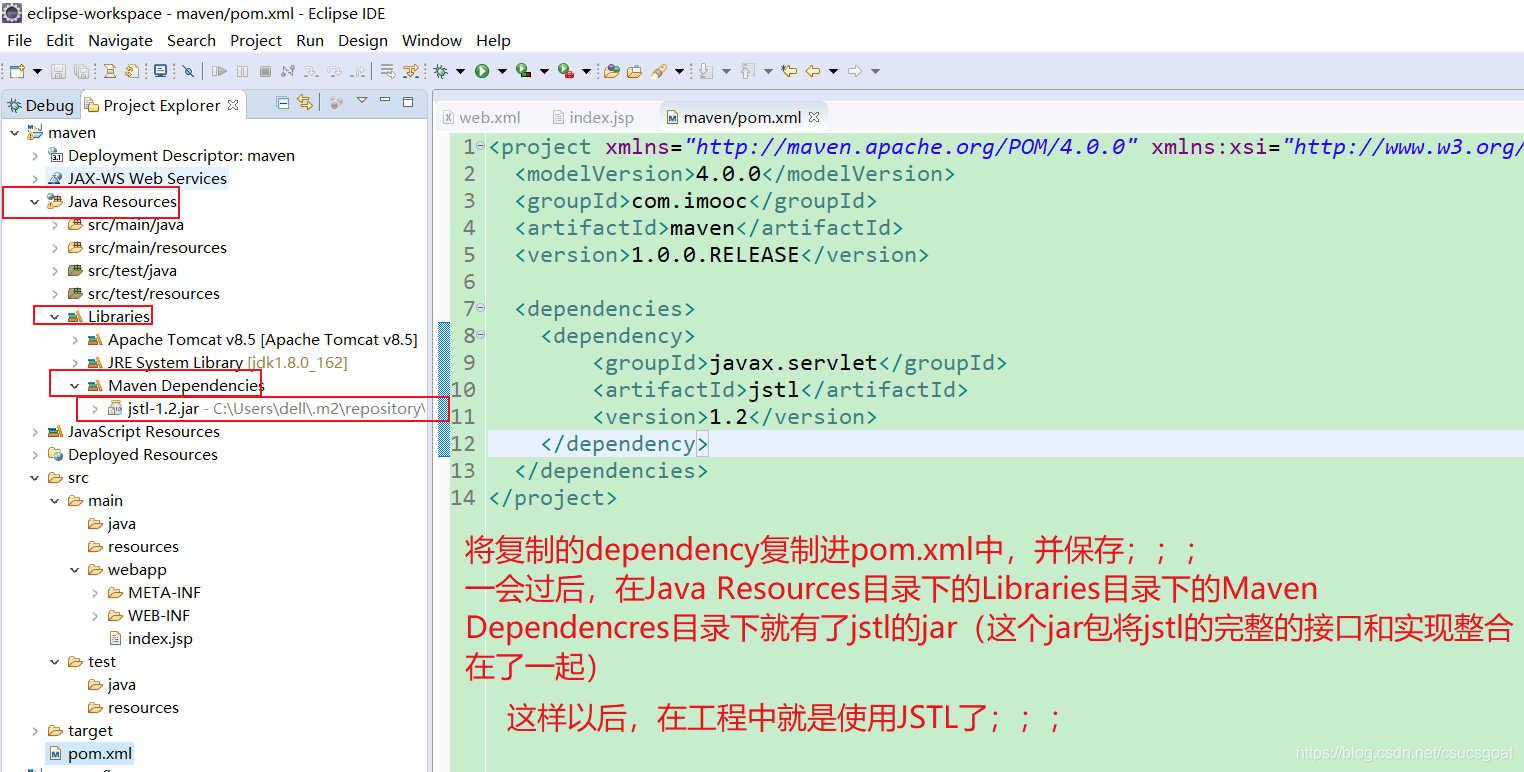 比如,以前想要使用JSTL(JSP标签库),需要下载JSTL的jar包,然后将这个jar包复制到工程的lib目录下,然后将jar包引入到工程中。但是在有了Maven后,这种“手动下载jar包,然后手动引用到工程中”的方式就成为了过去式,取而代之的只需要在pom.xml中增加响应的依赖就可以了。