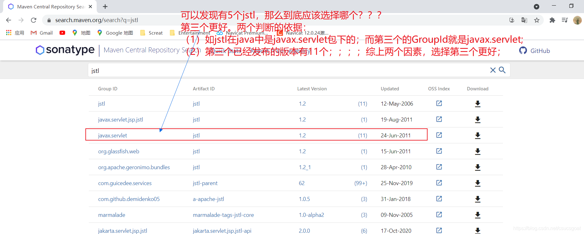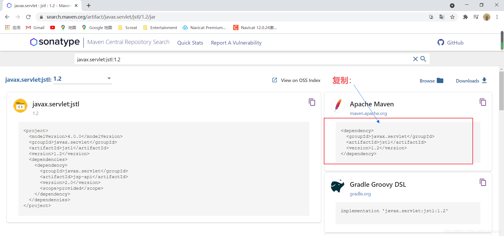 Maven中央仓库的检索网站:https://search.maven.org/,并查询jstl;
