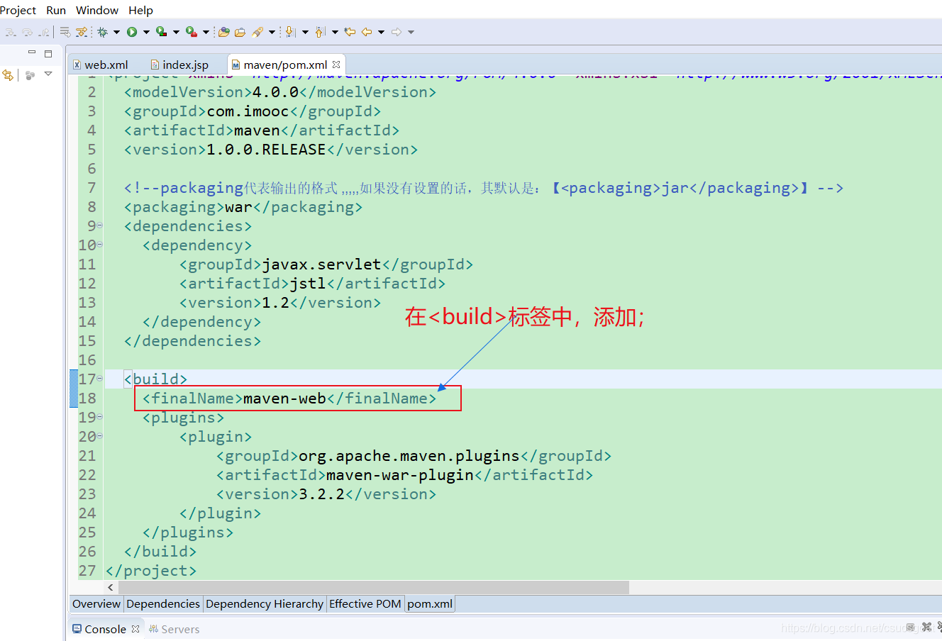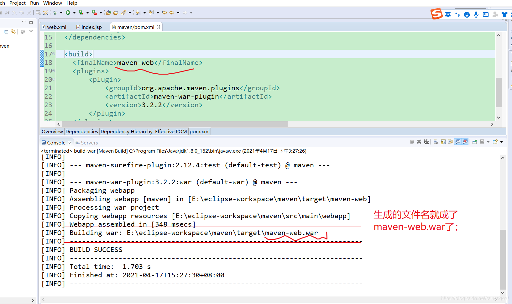 即,通过【<finalName>maven-web</finalName>】可以简化,输出war包的文件名,进而简化在浏览器访问时的ContextPath上下文路径。