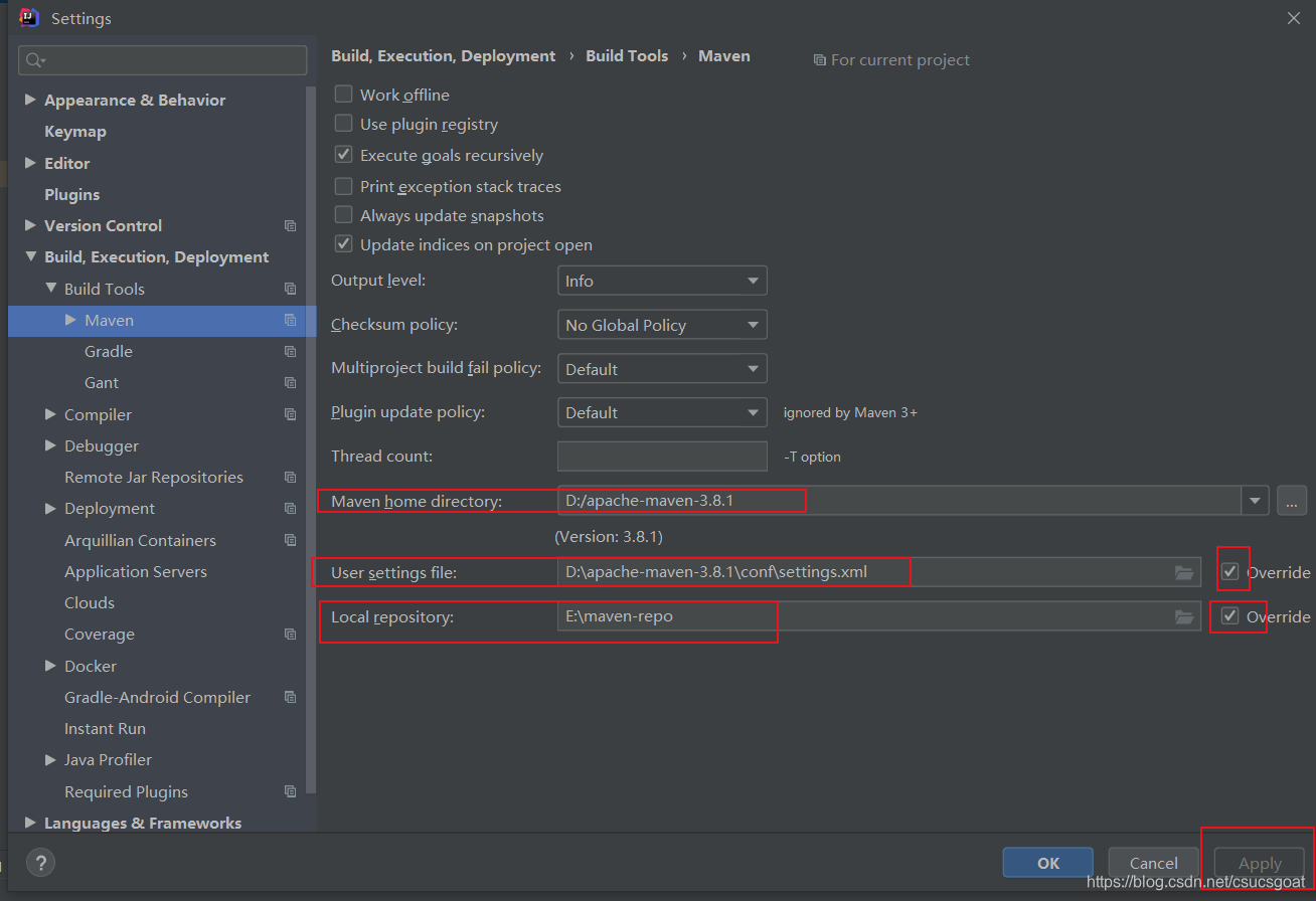 打开settings的设置界面:设置成本地的maven,然后记得apply。