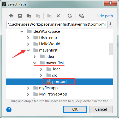 选择自己的项目下的pom文件。(IDEA会依次找到真正的maven项目,也就是下图中画横线的这个文件件,而不是箭头所指的文件夹。出现这种情况,一般是因为我们打开项目的时候选择了外面层的目录)例如: