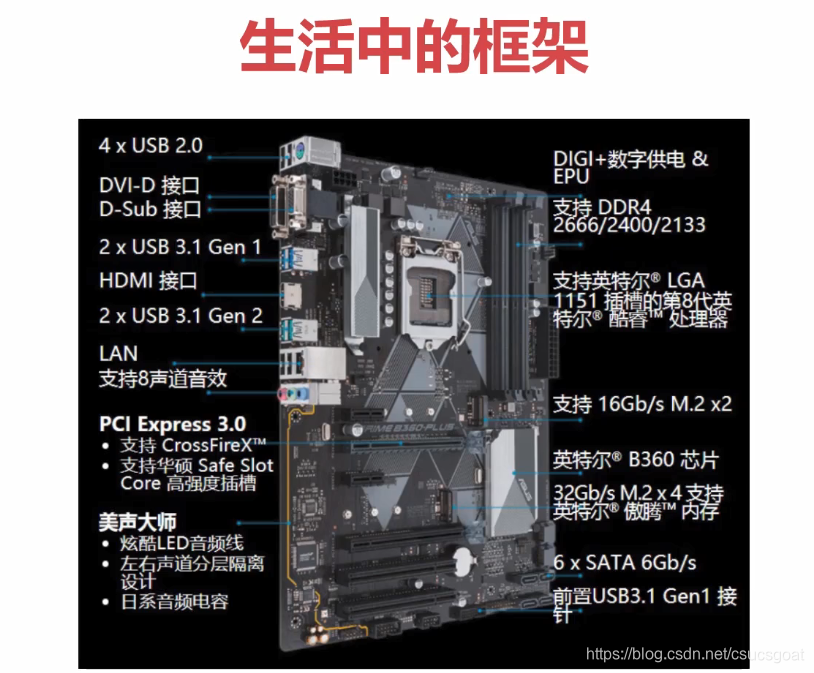 主板的主要职责,就是承载其他的硬件。在这块主板上并没有CPU、内存、硬盘,有的只是各种各样的接口,只要CPU、内存、硬盘这些符合主板的接口的标准,把CPU、内存、硬盘插上就能用。这个主板就起到了结构性的作用,像骨架一样。