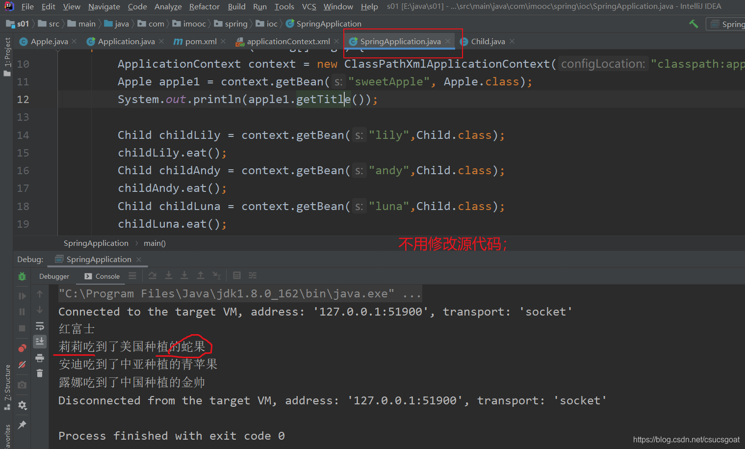 完全不需要修改源代码,因为IoC中的对象是通过配置得来的,所以这儿我们只需在applicationContext.xml配置文件中,增加蛇果这个Apple对象的配置就行了,不用修改任何源代码;