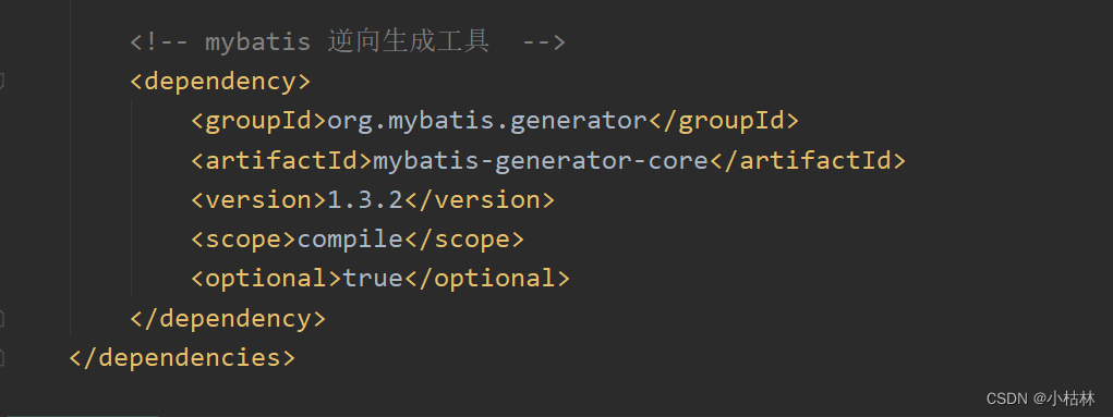 (3)【mybatis-generator-core】依赖,这个依赖就是用来生成实体类、mapper接口、mapper.xml等逆向文件;