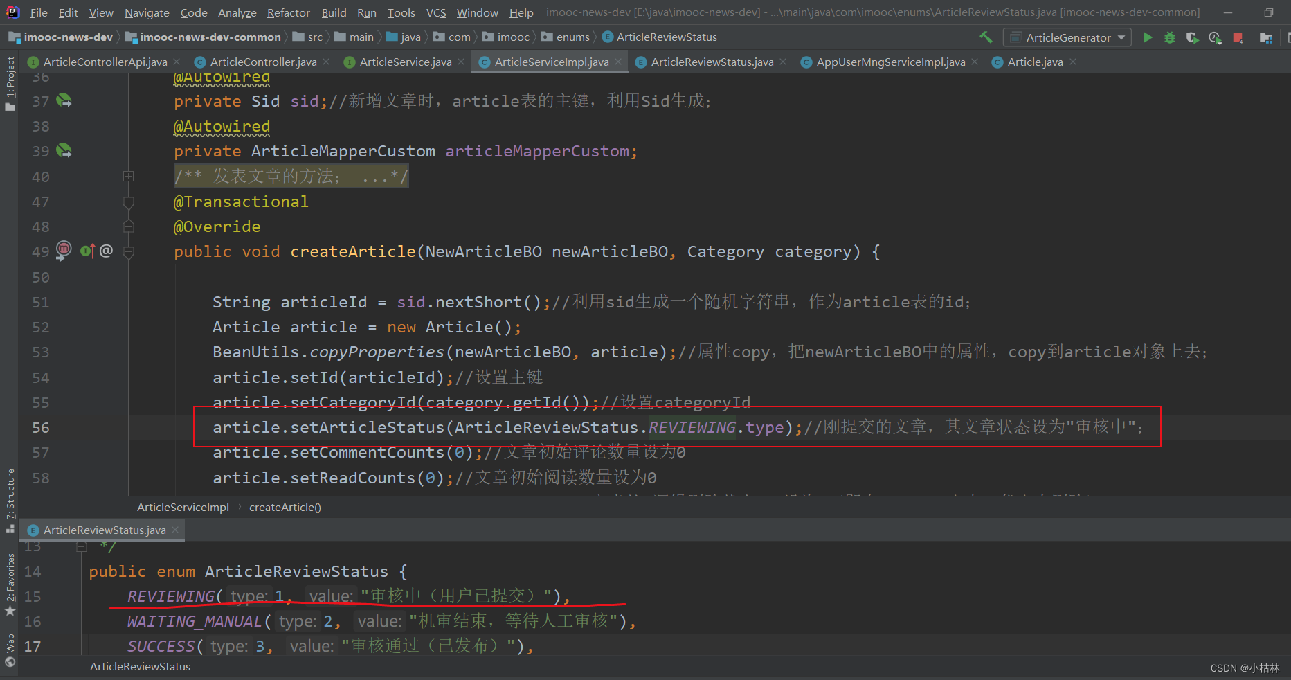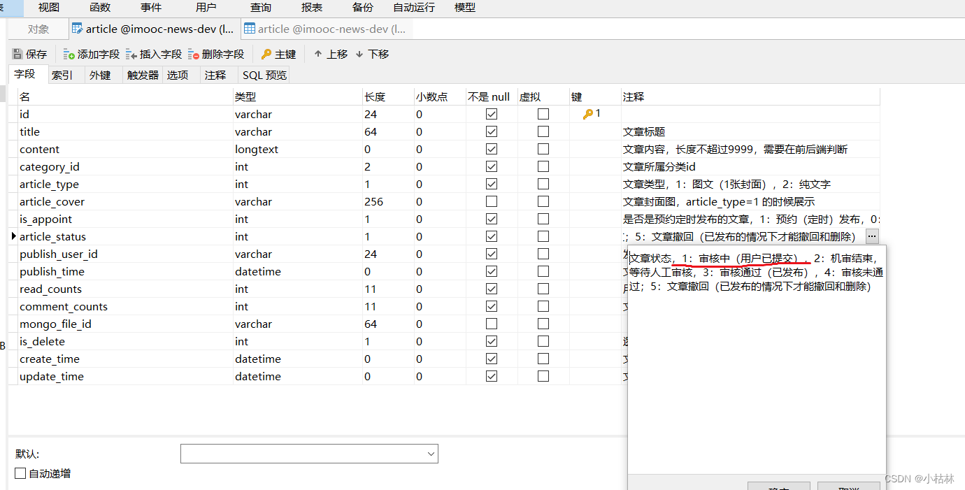 (1)用户发布了一篇文章后,该篇文章就入库了;然后,该文章的初始状态一般就是【1,"审核中(用户已提交)"】;