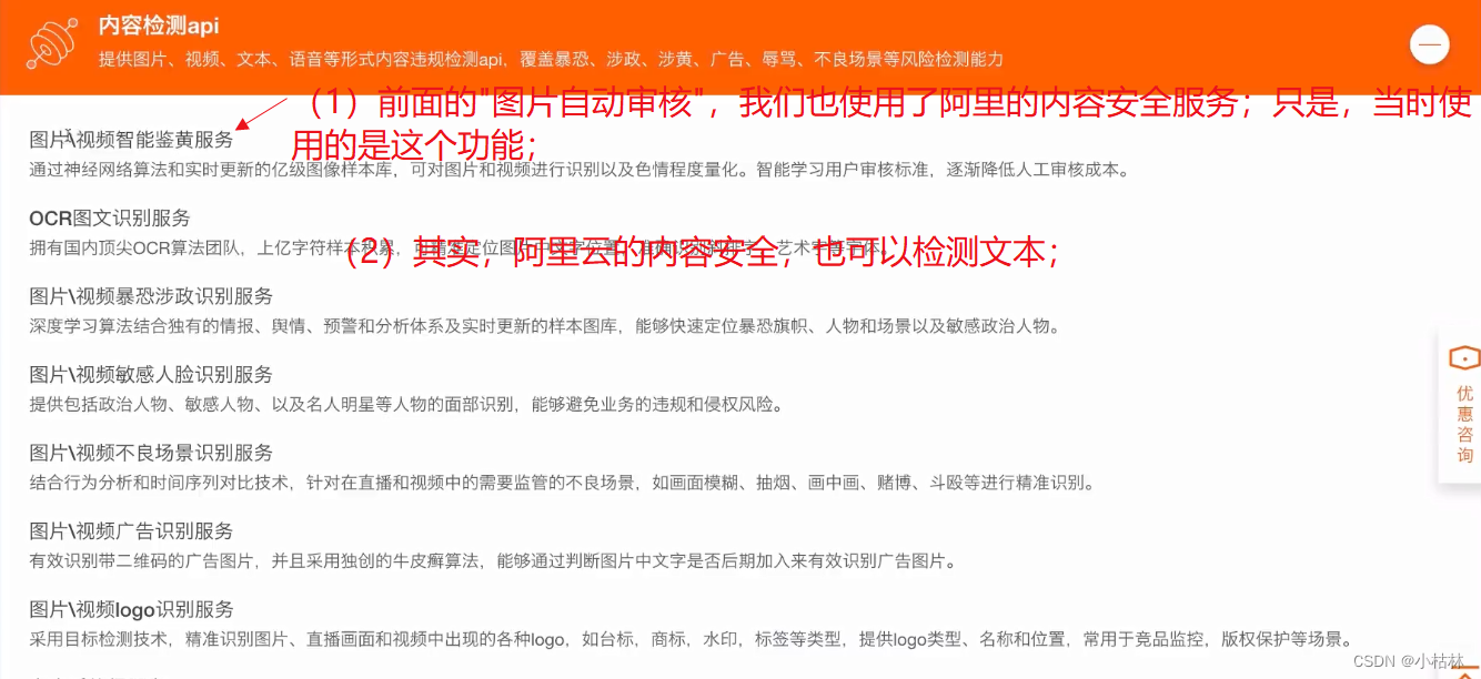 (3)本篇博客,就来介绍机审;我们使用阿里的内容安全服务,来做;但该服务太贵了,自己并没有实际做;