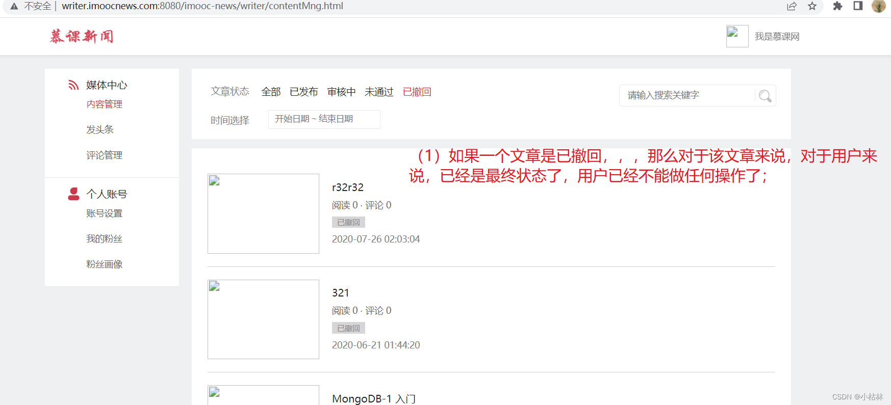 ● 用户撤回一篇文章后,改文章的状态就变更为了已撤回;这也是文章的最终形态;