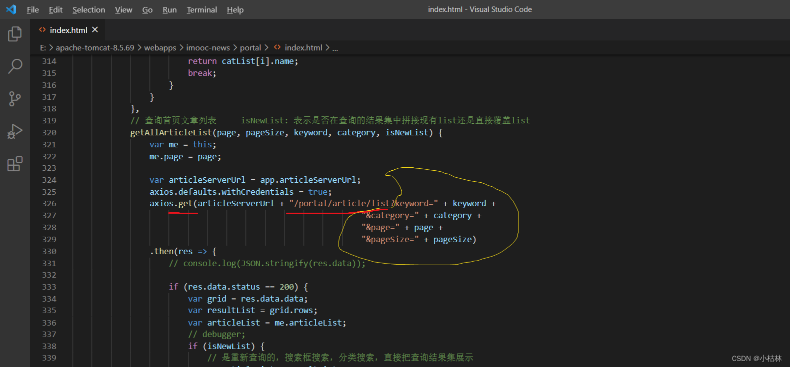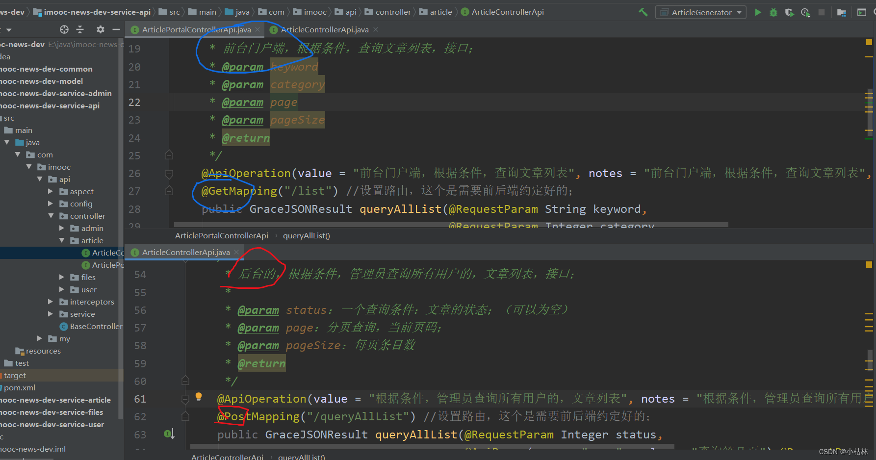 /** * 前台门户端,根据条件,查询文章列表,接口; * @param keyword * @param category * @param page * @param pageSize * @return */ @ApiOperation(value = "前台门户端,根据条件,查询文章列表", notes = "前台门户端,根据条件,查询文章列表", httpMethod = "GET") @GetMapping("/list") //设置路由,这个是需要前后端约定好的; public GraceJSONResult queryAllList(@RequestParam String keyword, @RequestParam Integer category, @RequestParam Integer page, @RequestParam Integer pageSize);说明: