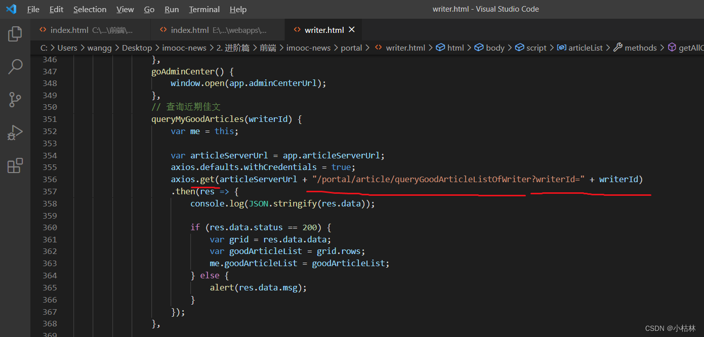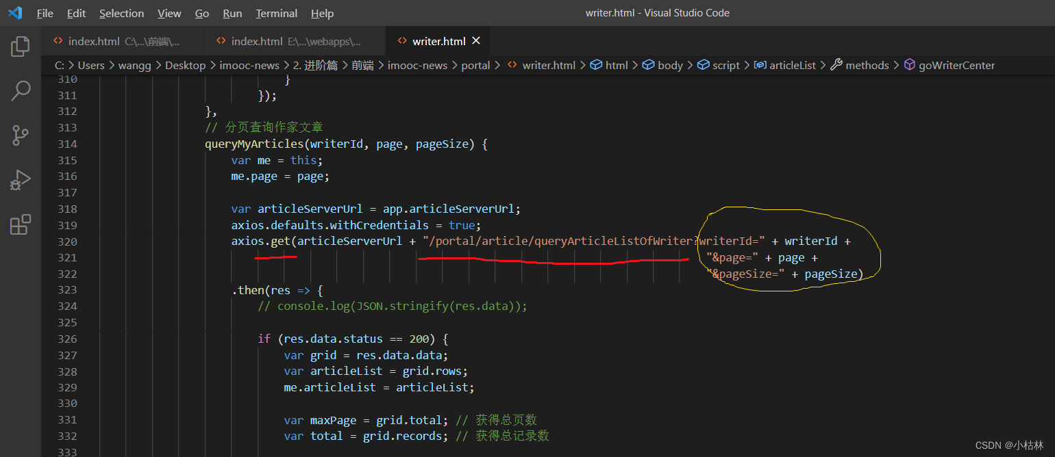 /** * 作家个人展示页,查询文章列表,接口; * @param writerId:查询的是哪个用户,该用户的id; * @param page * @param pageSize * @return */ @ApiOperation(value = "作家个人展示页,查询文章列表", notes = "作家个人展示页,查询文章列表", httpMethod = "GET") @GetMapping("/queryArticleListOfWriter") //设置路由,这个是需要前后端约定好的; public GraceJSONResult queryArticleListOfWriter(@RequestParam String writerId, @RequestParam Integer page, @RequestParam Integer pageSize); /** * 作家个人展示页,查询最新热闻,接口; * @param writerId * @return */ @ApiOperation(value = "作家个人展示页,查询最新热闻", notes = "作家个人展示页,查询最新热闻", httpMethod = "GET") @GetMapping("/queryGoodArticleListOfWriter") //设置路由,这个是需要前后端约定好的; public GraceJSONResult queryGoodArticleListOfWriter(@RequestParam String writerId);说明: