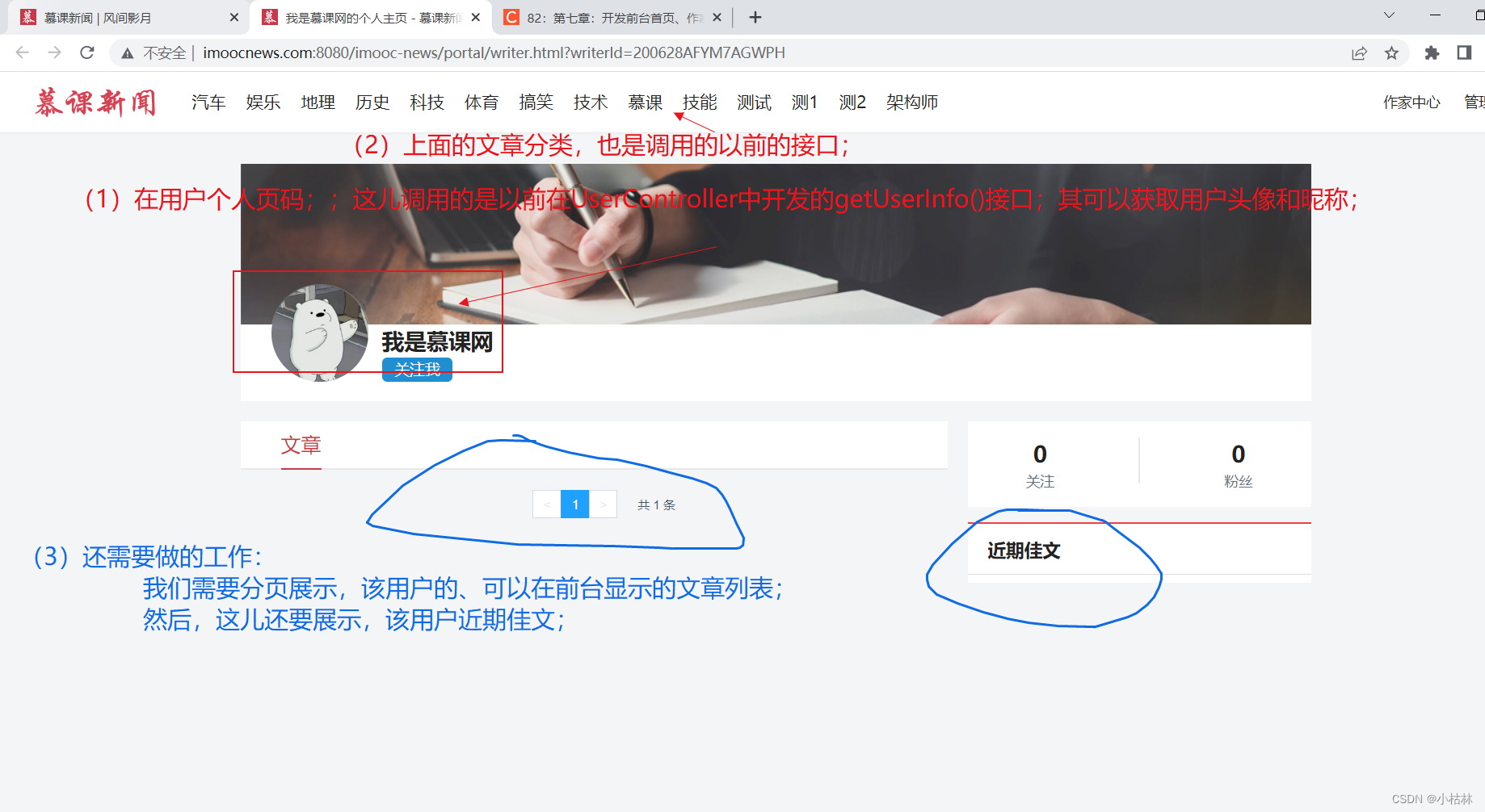 二:开发【作家个人展示页,展示文章列表,接口】、【作家个人展示页,展示近期佳文,接口】:Controller层;