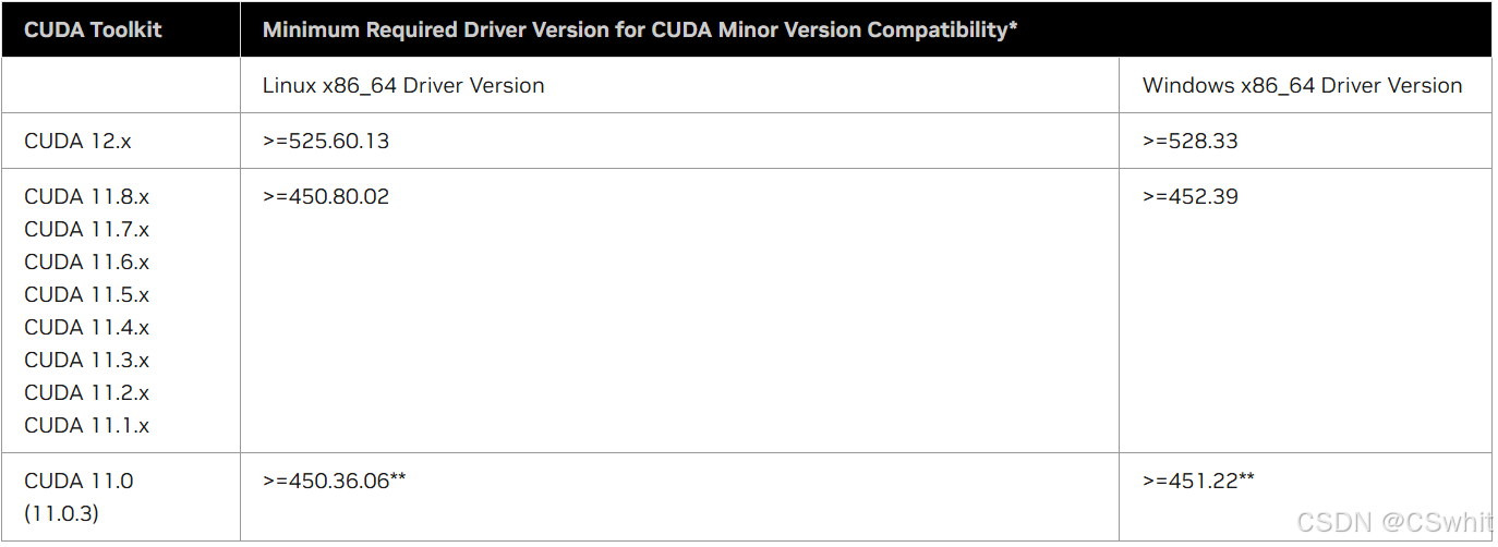 贴个CUDA官网对应版本的图,具体的可以到官网看1. CUDA 12.8 Release Notes — Release Notes 12.8 documentation