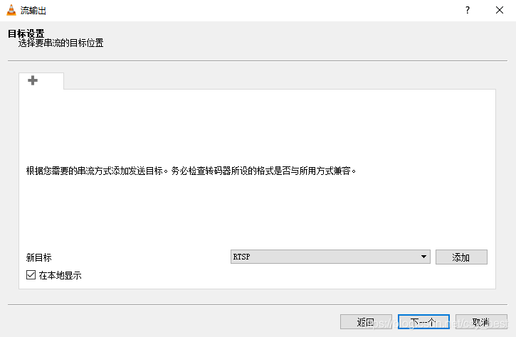 4.新目标选择“RTSP”,[可选]在本地显示,然后点击添加按钮