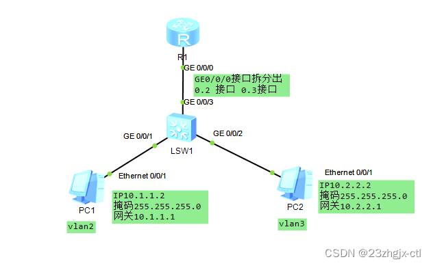 [LSW1]vlan batch 2 3 #//设置VLAN2和VLAN3