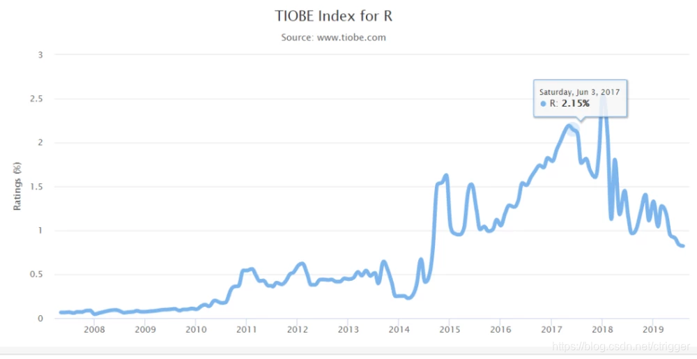 关于 R 的下降的报道被无端的夸大了,以我的经验,如果你仔细观察 R 的增长曲线,你会发现它还在增长,只不过增长势头不如Python而已。
