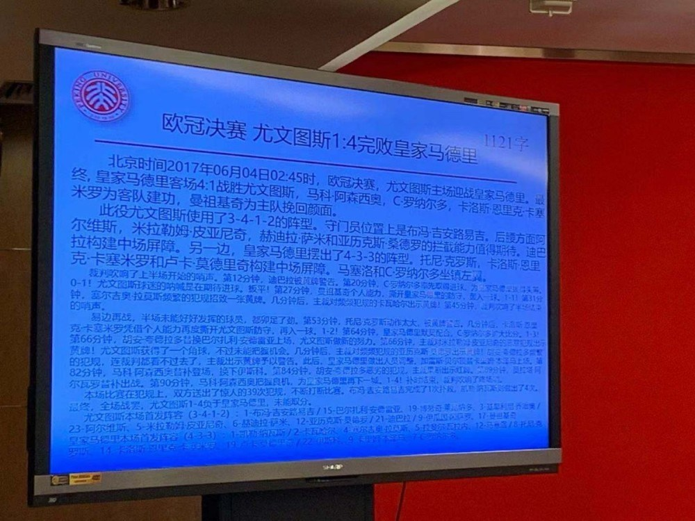 他还通过PPT现场展示了AI机器人写的体育赛事简讯、报道以及棋类比赛解说词等。记者注意到,机器人写的体育简讯,集中在出场阵容、队员名称、比分、时间等要素;篇幅较长的体育赛事报道,仍以数据信息为主,并加入一些描写,比如“拦截能力值得期待”“坐镇左翼”“构建中场屏障”等。