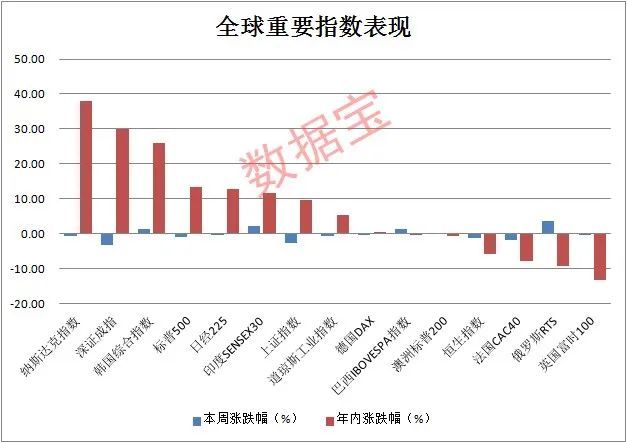 美股市场,市值超千亿美元的公司中迪士尼、丰田汽车和礼来本周表现最好,分别累计上涨14.00%、9.2%、7.81%,表现差的分别是Snowflake、高通、汇丰控股和赛诺菲安万特,分别下跌8.70%、8.46%、6.42%和6.27%。 近一周,全球重要指数表现来看,涨跌互现,俄罗斯RTS和印度SENSEX30表现最好,周涨幅分别为3.48%和2.28%,深证成指和上证指数表现最差,分别下跌3.36%和2.83%。 今年接近尾声,全球重要指数中,涨幅最大的是纳斯达克指数,累计上涨37.95%,紧随其后的是深证成指的29.95%。英国富时100和俄罗斯RTS指数表现最差,今年分别累计下跌13.2%、9.31%。