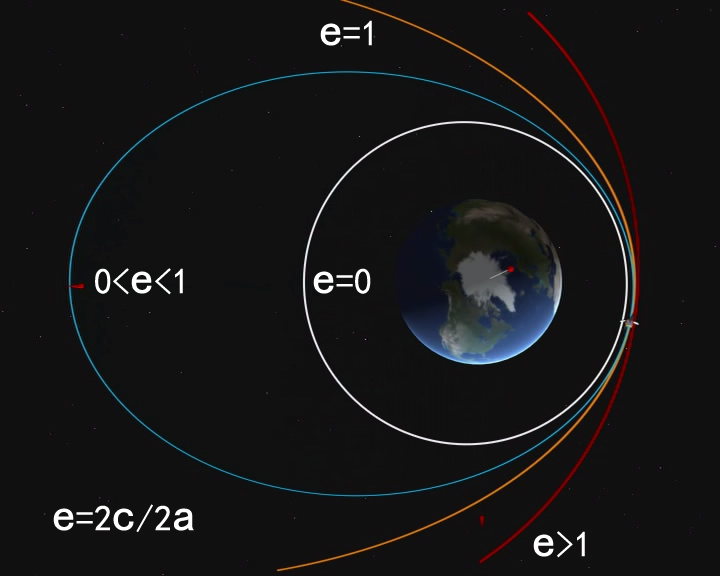 偏心率e用于描述某一轨道与圆轨道的区别,对于椭圆,偏心率e大于0小于1;对于抛物线,偏心率e等于1;对于双曲线,偏心率e大于1;圆轨道的偏心率为0。