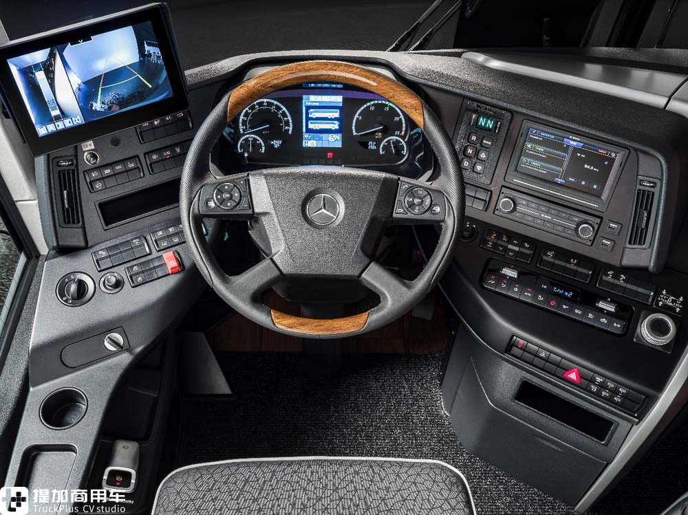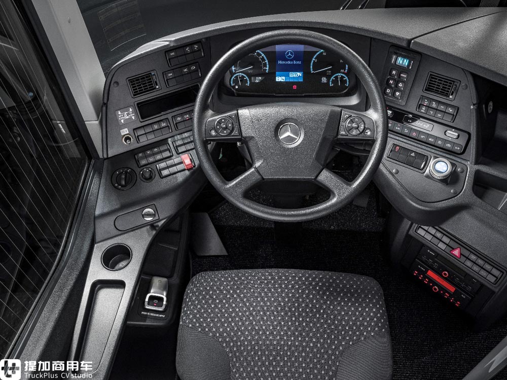 在外观设计上,车辆将奔驰的风格展现得淋漓尽致。不管是其镜面奔驰车标,还是其盾形镀铬前中网,设计语言都与乘用车型遥相呼应。即使是在异国他乡,也能瞬间辨认出它的归属。测试车上裸露的防撞吸能保险杠融入了车身整体,减小风阻的同时提升了视觉表现。