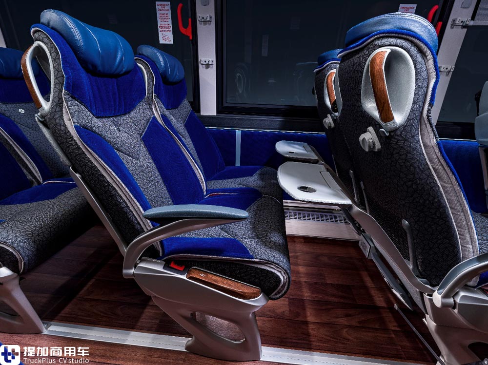 Premium车型采用了真皮+实木的混合方向盘,并安装了大尺寸的娱乐屏幕,带来最豪华的体验。乘客区域的空调功率为45千瓦,司机区域独享一台9kw的空调。