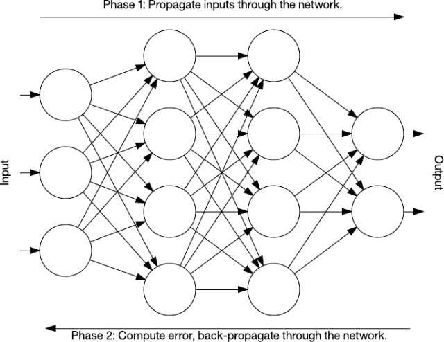 在训练过程中,该网络的中间层会自己进行组织,将输入空间的部分映射到输出空间。反向传播,使用监督学习,可以识别出输入到输出映射的误差,然后可以据此调整权重(使用一个学习率)来矫正这个误差。反向传播现在仍然是神经网络学习的一个重要方面。随着计算资源越来越快、越来越便宜,它还将继续在更大和更密集的网络中得到应用。