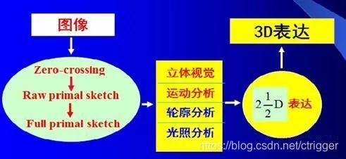 算法部分是马尔计算视觉的主体内容。马尔认为,从图像到三维表达,要经过三个计算层次:首先从图像得到一些基元(primal sketch), 然后通过立体视觉(stereopsis)等模块将基元提升到2.5维表达,最后提升到三维表达。