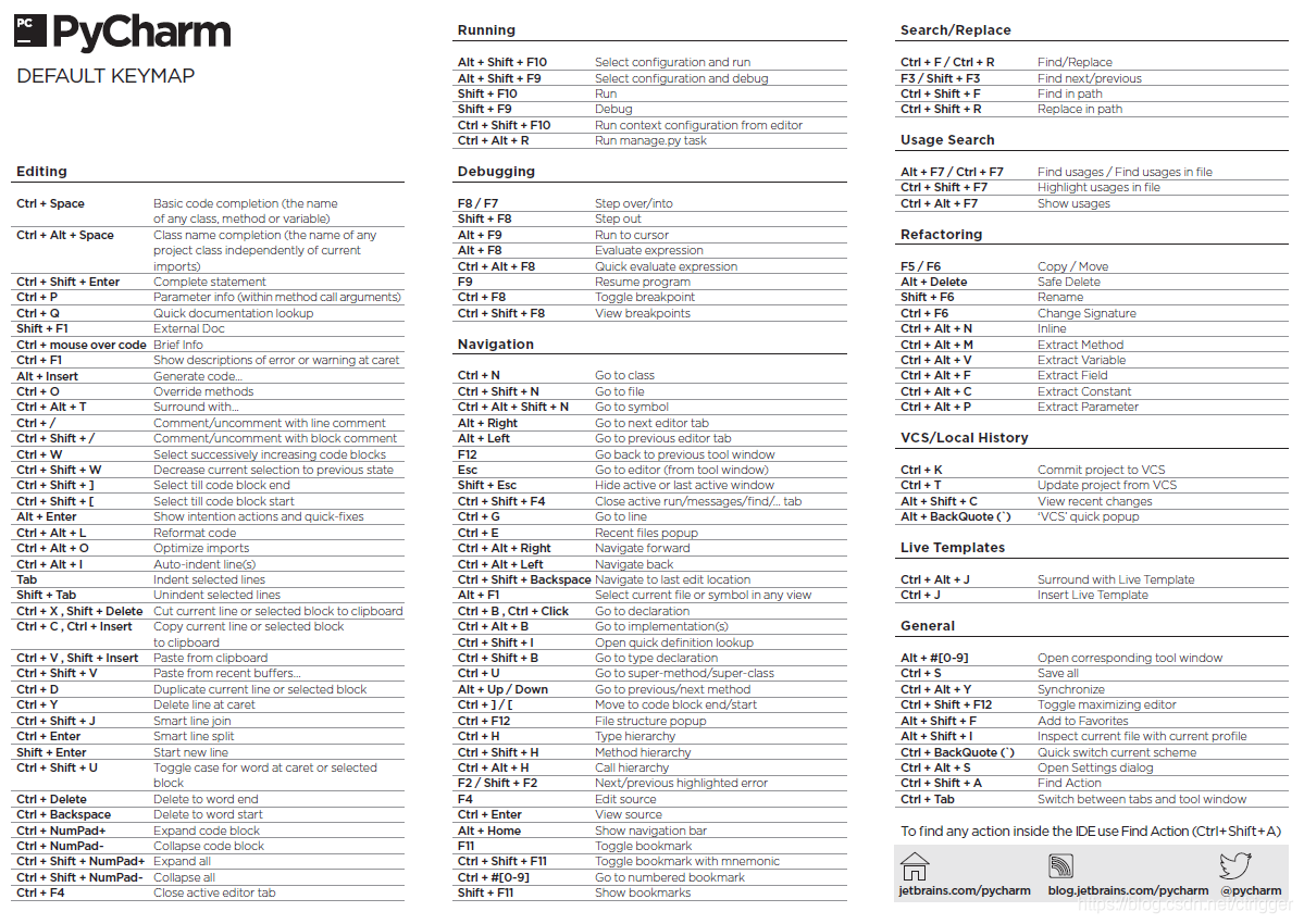 Pycharm中打开Help->Keymap Reference可查看默认快捷键帮助文档: