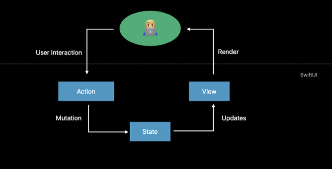 用户交互过程中,会产生一个用户的action,从上图可以看出,在SwiftUI中数据的流转过程如下: