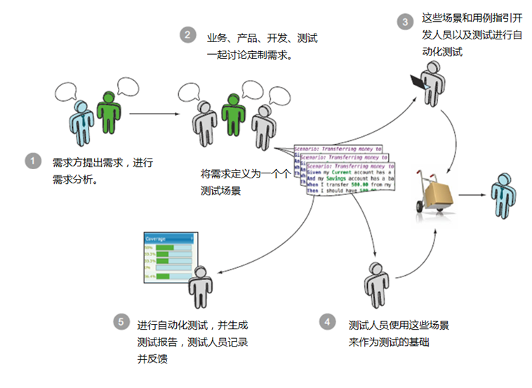 采用 BDD 流程进行开发,由外而内,持续地描述当前系统或模块的行为,并为之实现自动化(即步骤定义)。当产品代码部分完成后,右侧的一系列测试活动都已经自动化了。