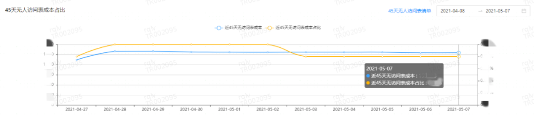 1)近30天无访问表的成本占据总存储的20%,其中99%是临时表。这些无访问表由BU内部进行确认清理,一些日志表或者集团的用户行为数据等需要长期保存的会加入白名单,没有加入白名单的表会自动删除。