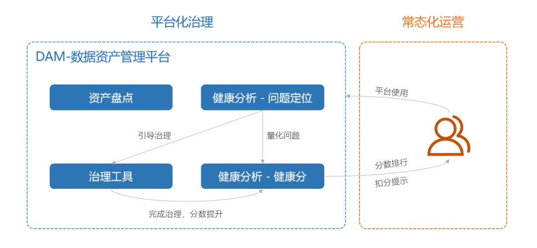 数据资产管理平台目前有三大功能模块,分别是资产盘点、治理工具、健康分析。三个模块的关系如下图所示: