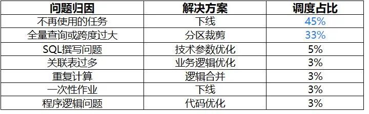 计算资源主要消耗在ETL调度和Adhoc查询,由此我们对典型低效SQL进行了归因分析。选择部分BU作为试点,针对单次消耗大于10元的高消耗调度进行优化。虽然集团内这些高消耗调度占比1%,但是占据了千万量级的年计算成本。