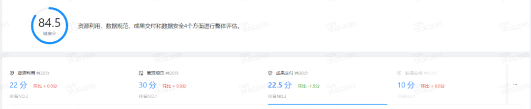 第三个模块是数据健康分析。分为资源利用、管理规范、成果交付、数据安全四个维度对数据的健康状态进行统计。BU内部想要提质降本、提高开发效率,健康分会是一个最直观的指标。如果有BU疏于数据治理,那么相应的健康分和BU之间的排名就会下降,以此来促进常态化治理。下图为数据健康分总览。