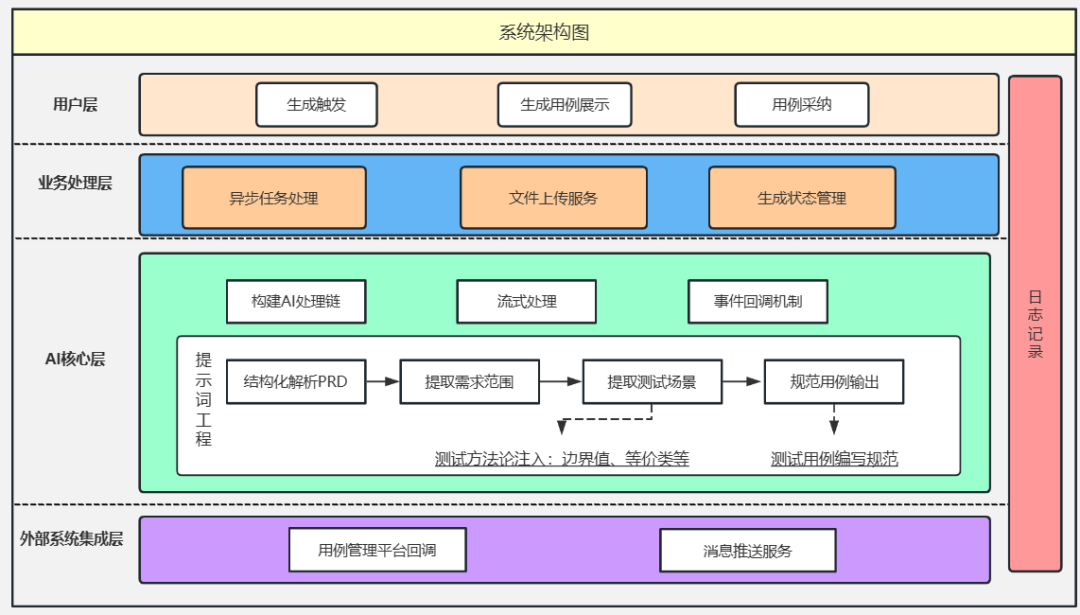为了提高测试用例生成的效率和质量,本项目设计了一套基于AIGC技术的智能化解决方案,实现从PRD到测试用例的自动化转化。系统架构分为以下几个关键层次: