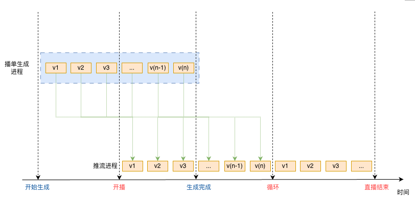 根据这个思路我们创新性的设计了一种全新的推流模式,即基于播单的直播推流,大大降低了对高性能服务器资源的依赖,可以使用空间换时间的方式逐步生成。
