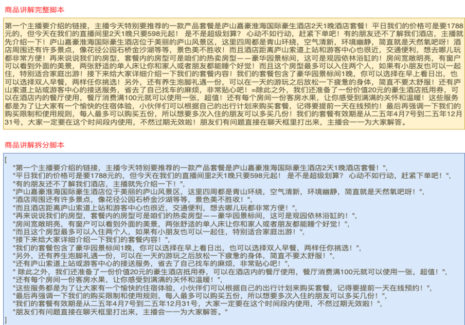 为了在直播中能及时的回复用户评论,还能合理打断主播对商品的讲解,在脚本提交后需要对脚本进行拆分,根据我们对大量真人主播的观察和分析,每句话保持在15秒以内,既能保证商品讲解的顺畅进行,也保证回复的时效性。如下图所示: