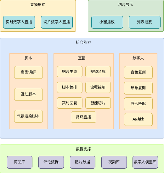数字人直播主要依托于智能脚本、直播内容生成与流程控制、数字人视频生成和多维度的数据支撑等几个核心技术能力。