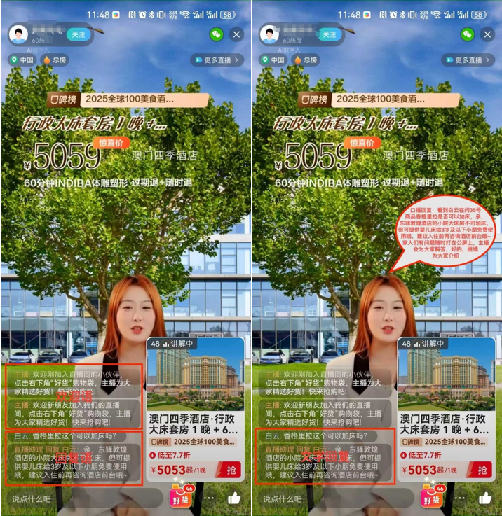 实时互动,支持根据观众行为(如评论、下单、进入直播间)作出适当响应,包括解答疑问、欢迎新观众及讲解指定商品等互动行为;
