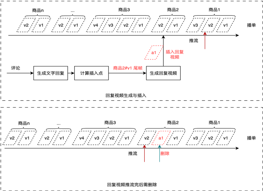 依据对大量真人直播的观察与分析,我们可以按照真人主播说话频率将视频切分为15秒左右的片段,从而可以将视频片段粒度进一步细化,然后将这些片段按照顺序进行排列,加入播单,并且保证商品与这些片段进行关联,确保商品上下架时能精确删除和添加这些视频片段,在直播中回复视频插入到正在讲解的视频片段后面,就可以及时的视频回复用户了。