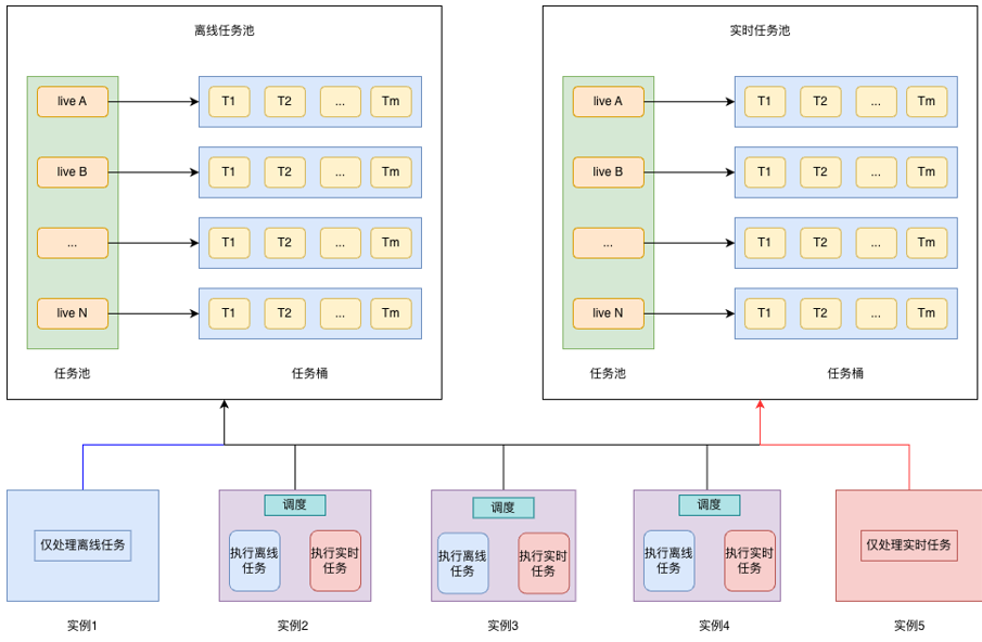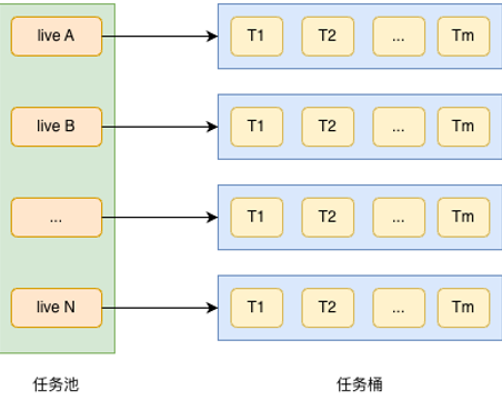 本项目设计了分任务分实例调度方案,首先是任务维度,分为两种,即离线任务与实时任务,建立两个任务池,当任务请求进来时根据类型分别加入到各自的任务池,并且按照加入时间排序,保证先进先处理。另外,对于同一场直播要求合成的视频画面是连续的,因此需要对任务进一步细分,按照liveId分桶,同一个liveId的任务放在一个桶内,按照先后顺序排序,保证任务执行生成的视频首尾帧相连。如下图所示: