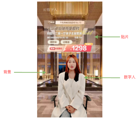 数字人直播的画面主要由数字人、背景、贴片构成,在一场直播中数字人形象一般不可变化,背景和贴片需要根据讲解的内容进行切换。