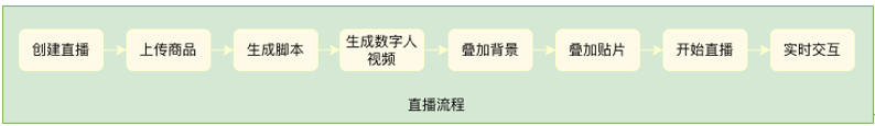 实时数字人直播流程主要包括创建直播间、上传商品、生成商品脚本、生成数字人视频、叠加视频背景、叠加商品贴片、生成直播视频、开始直播和直播互动,直播可以设置循环周期,在设定周期内循环直播。