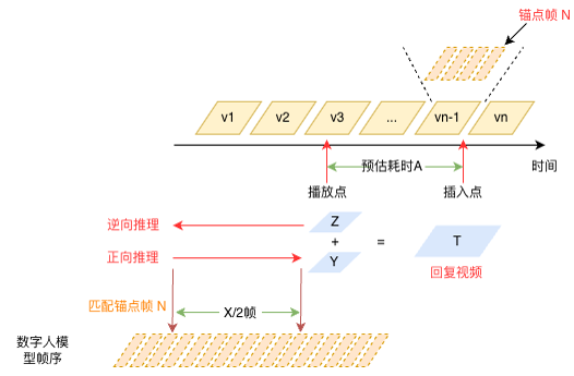 2)状态感知与定位:当生成完回复文字脚本后,根据以往生成视频耗时预测当前回复视频生成耗时A,再根据当前推流进度找到时间A的插入点,获取到插入点片段的锚点帧(记为第 N 帧)。