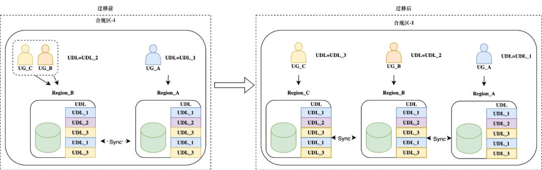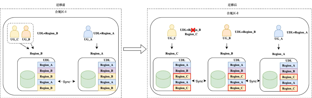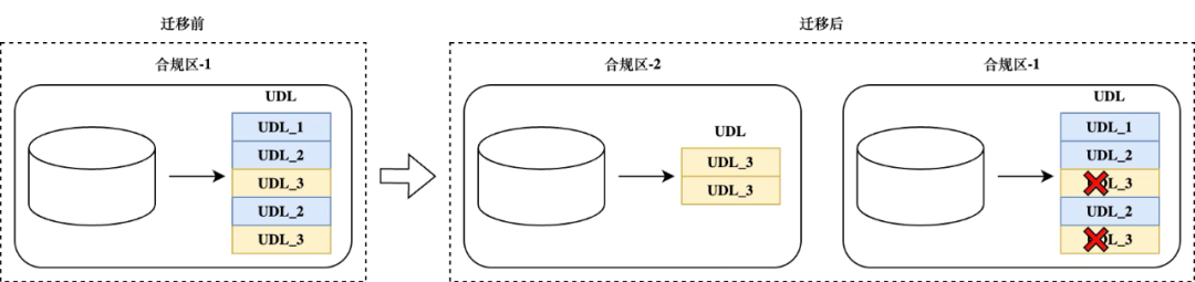 合规区调整场景(见图16)为了将 USER_GROUP_B 用户迁移到新的合规区中,仅需要将所有 UDL=UDL_3 的数据迁移到合规区-2。