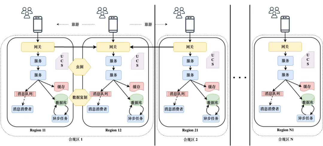 前文的设计思考阐述了全球化背景下软件架构面临的核心挑战及应对方案。通过引入DRC、X-Pipe、MQ-Mirror等组件,实现跨Region数据同步,增强全球化架构的可用性;通过UCS流量调度与虫洞传输技术,确保用户数据处理的一致性。在数据合规方面,引入合规区概念,通过与 UDL 流量调度方案的结合,实现数据存储与处理的合法闭环。最终得到了如图 21 所示的全球化总体方案: