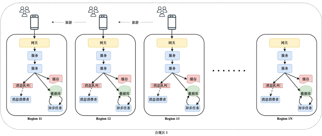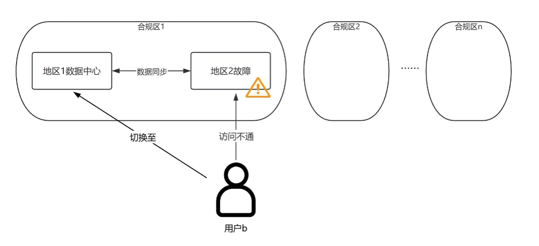 同一个合规区内通常会有多个 Region,Region 间的通信链路存在延迟高、不稳定的特点,通常情况下每个 Region 需要具备独立承载数据读写的能力。在合规区内采用如图12所示的简单多 Region 架构会有一定的缺陷:假如遇到单 Region 故障,用户的请求会被路由到同合规区内的其他可用 Region 进行处理,但是此时 Region 内没有该用户相关的数据,无法完成相关的业务处理。