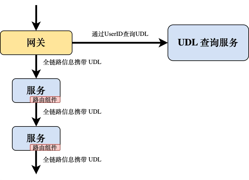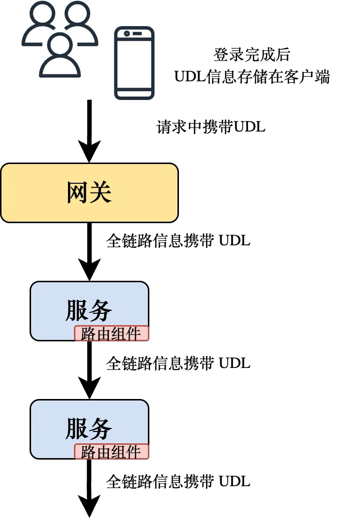 再进一步思考,用户的 UDL 其实是一个相对稳定的元信息,可以在用户登录时随登录态一并下发到客户端上。UDL由客户端框架在请求中自动携带,并通过上述方式实现全链路传递,如下图 20 所示。